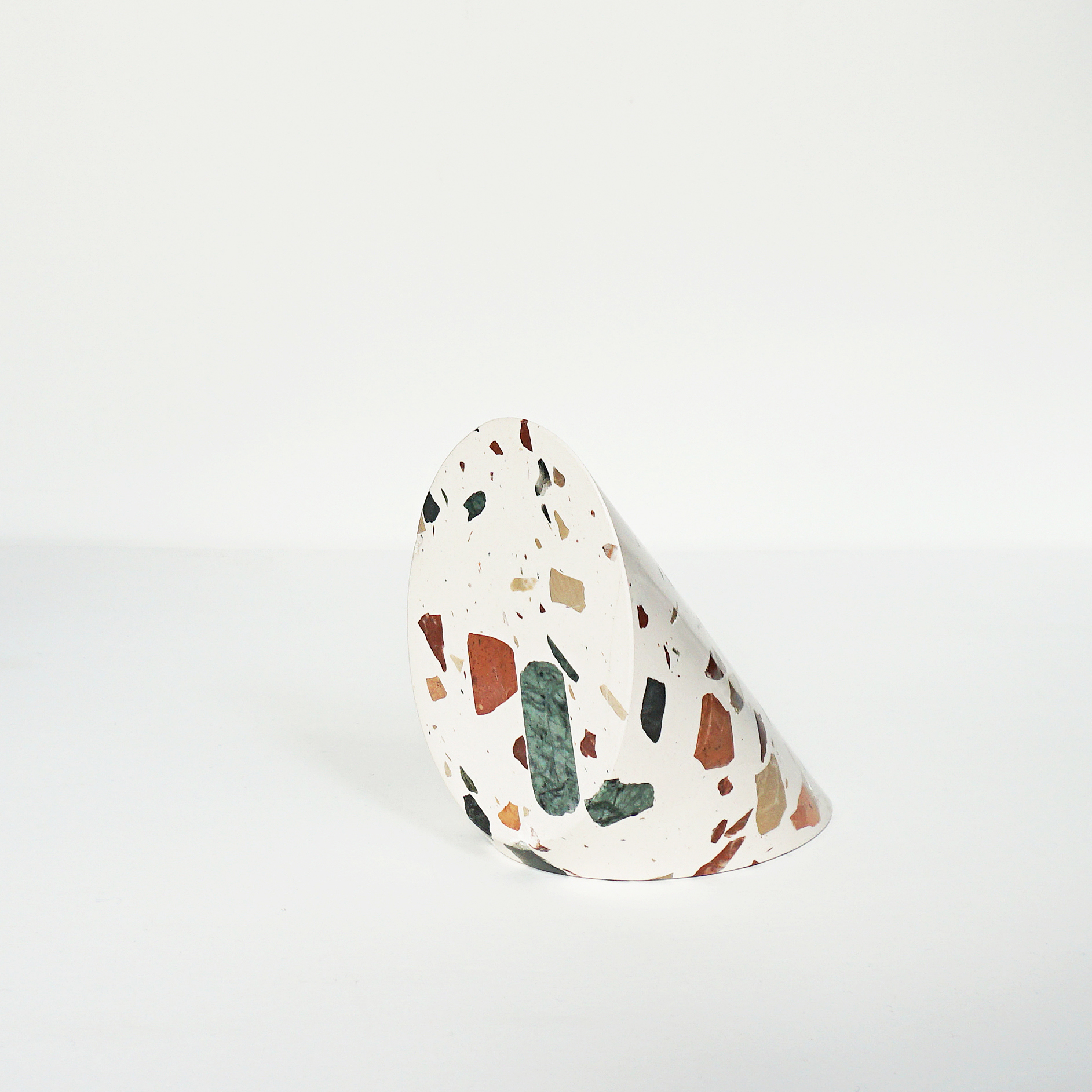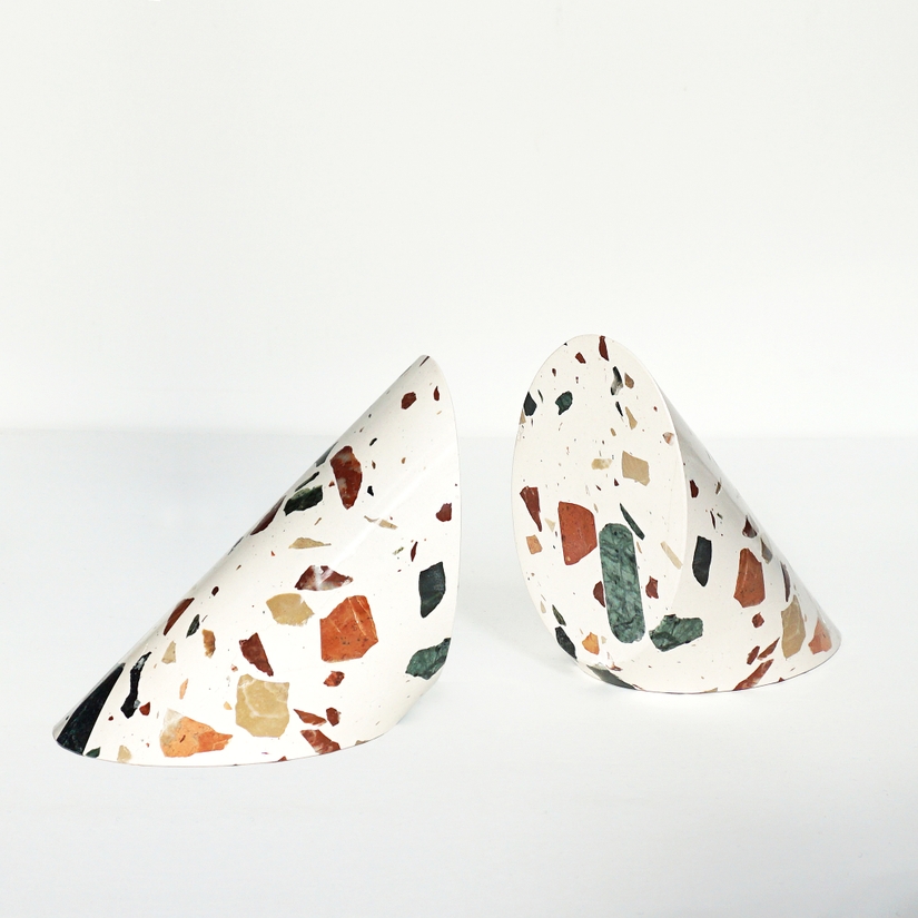 The SOLID bookends are simply pure material. The bookend is made out of a solid piece of marble or a bespoke block of terrazzo. Formally, the bookend can hardly hide its reference to architectural details of ancient buildings. The terrazzo is specially designed for Studio Hausen and uses waste products from stone production.